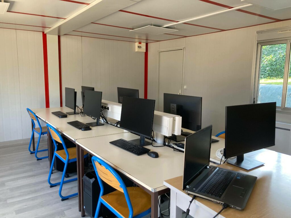 C’est sans conteste la pièce la plus importante de nos jours dans un établissement scolaire, d’autant plus avec la crise du COVID 19 qui nous a touché récemment. En mai dernier, les premiers travaux en salle informatique ont commencé. Notre but était de proposer une classe mobile avec 24 nouveaux postes informatiques. Après 3 mois de travaux, la salle est opérationnelle et est déjà très appréciée de nos élèves.